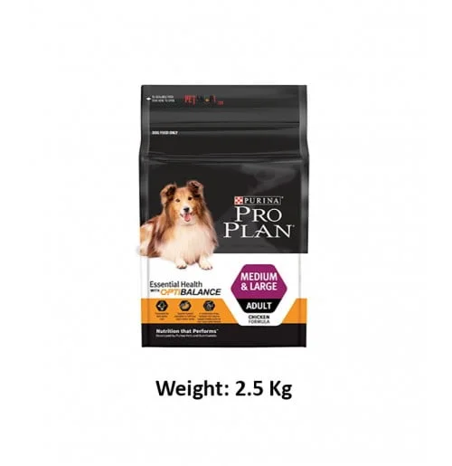 Purina Pro Plan Medium And Large Adult 2.5 Kg is a complete dry dog food designed for the needs of medium-sized adult dogs. This dry dog food is rich in chicken, and it has been specially formulated to meet all of his nutritional needs as part of a healthy lifestyle. This dry adult dog food is specially formulated for dental care. It helps support healthy joints for their active lifestyle, and it also help keep their coat shiny from root to tip. Rich in chicken, PURINA PRO PLAN DOG Medium Adult with OPTIBALANCE ensures that your dog gets all the nutrition he needs from mealtimes so he can live life to the full. Optibalance is a combination of specific nutrients that are balanced at levels to help keep your adult dog healthy.